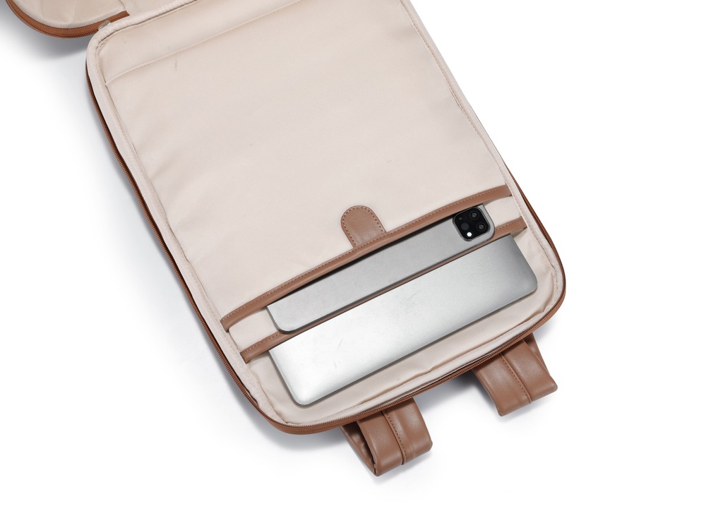 This image showcases the dedicated laptop sleeve designed to keep your device safe and protected. The soft cushioned lining prevents scratches, while the secure flap strap ensures your laptop or tablet stays firmly in place during travel. Finished with refined stitching and premium interior fabric, this compartment combines safety with sophisticated craftsmanship.