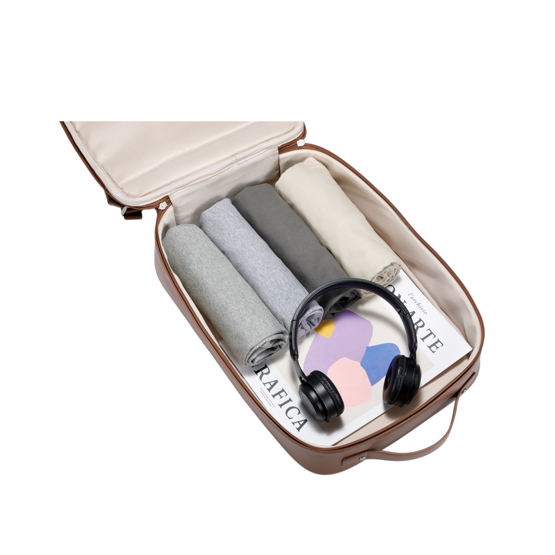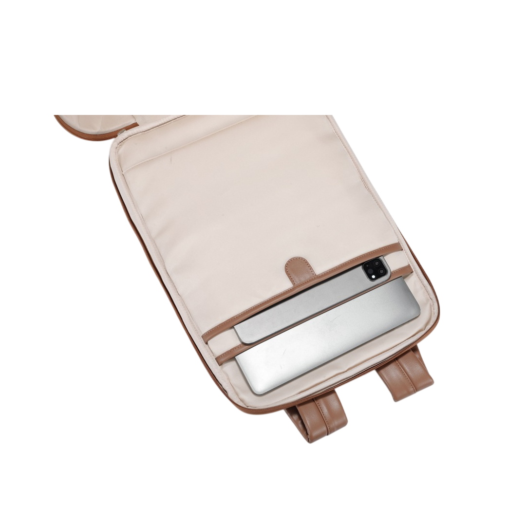 The roomy main section demonstrates the backpack’s generous storage capacity. Neatly packed clothing, accessories, and essentials highlight its travel-friendly design. The structured interior allows you to maximize space efficiently, making it ideal for short trips, business travel, or daily commuting. The smooth zip closure and durable lining enhance both convenience and durability.