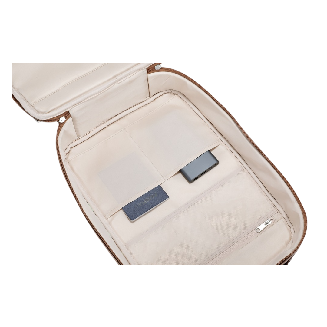 This close-up reveals thoughtfully designed inner pockets for organizing smaller valuables like passports, power banks, notebooks, or documents. The clean panel layout ensures easy access while maintaining a clutter-free interior. The premium fabric lining and precise stitching reflect durability and refined detailing.
